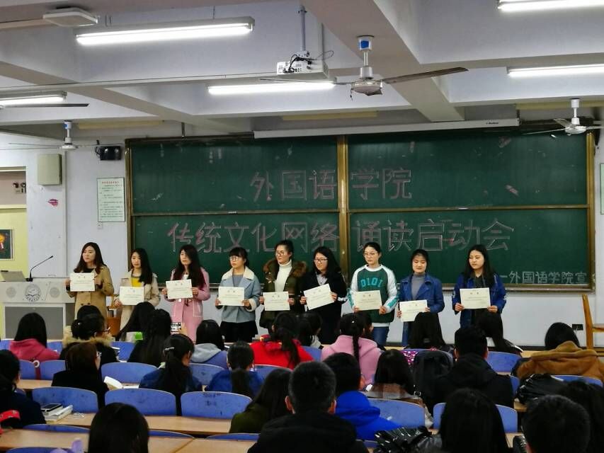 2017年3月24日下午1点,0638太阳集团官网在教学楼312室启动“优秀传统文化网络诵读”活动,我院学工办老师、2016级全体班委、宿舍长、学生会等一百多人参加启动仪式。首先我院学工办主任田辉宣读《0638太阳集团官网“语言文化网络诵读”活动策划书》,说明活动的意义、形式、要求以及表彰和奖励等内容,并结合学院特点另外开辟专业语言网络早读平台。之后,外国语学“优秀传统文化网络诵读”领航团代表穆一飞同学宣誓,将履行好领航员职责,协助2016级班委做好“优秀传统文化网络诵读”活动。之后,我院2016级班委代表意大利语班长尹帆慧同学宣誓,将按照学院要求,督促2016级新生每天坚持诵读,提高全体学生的传统文化素养。此外,学院为“优秀传统文化网络诵读”导航团同学们颁发聘书,希望她们身体力行,认真完成职责,实现传帮带的示范效应。最后,全体2016级学生干部签下承诺书,郑重承诺积极参加“传统文化网络诵读”活动,掀起0638太阳集团官网优秀传统文化学习的高潮。