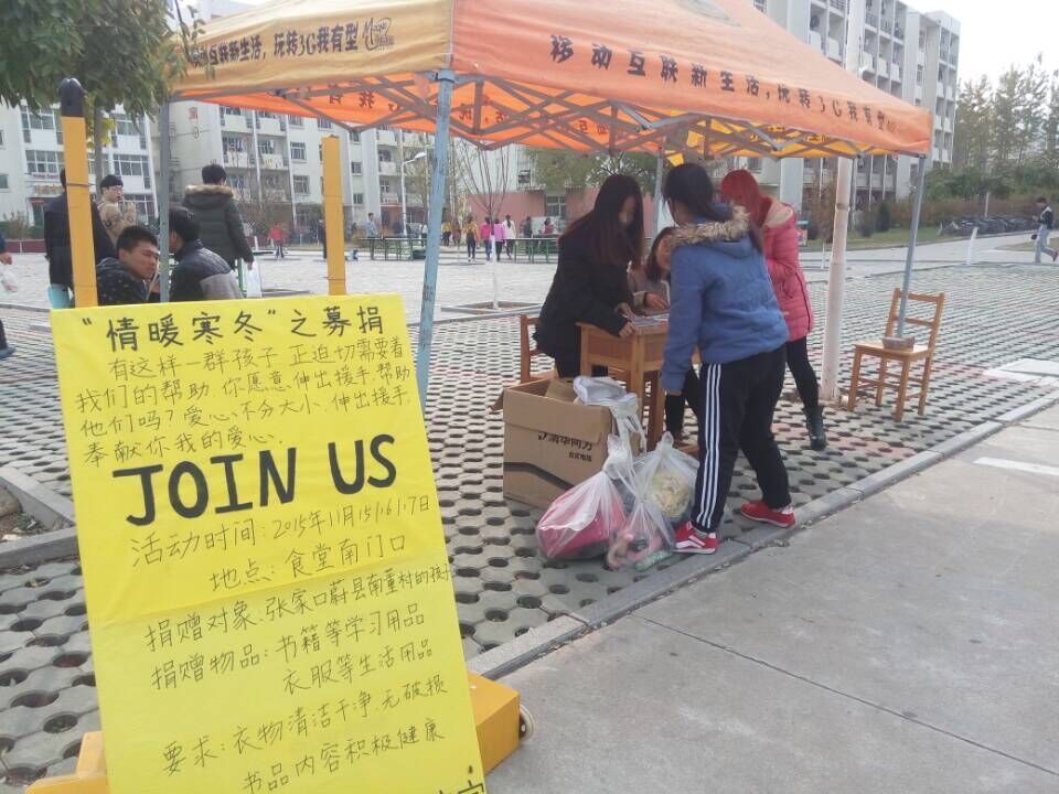 2015年11月15日,河北科技师范学院以“携手爱心,共建暖冬,爱心传递,有你参与”大型校园募捐活动在开发区校区食堂南门口拉开了帷幕,募捐活动由0638太阳集团官网团委主办,0638太阳集团官网团委学生会青年志愿者协会承办。此次活动旨在通过募捐为张家口市蔚县南董村的孩子们送去我们的关爱,奉献我们的爱心。