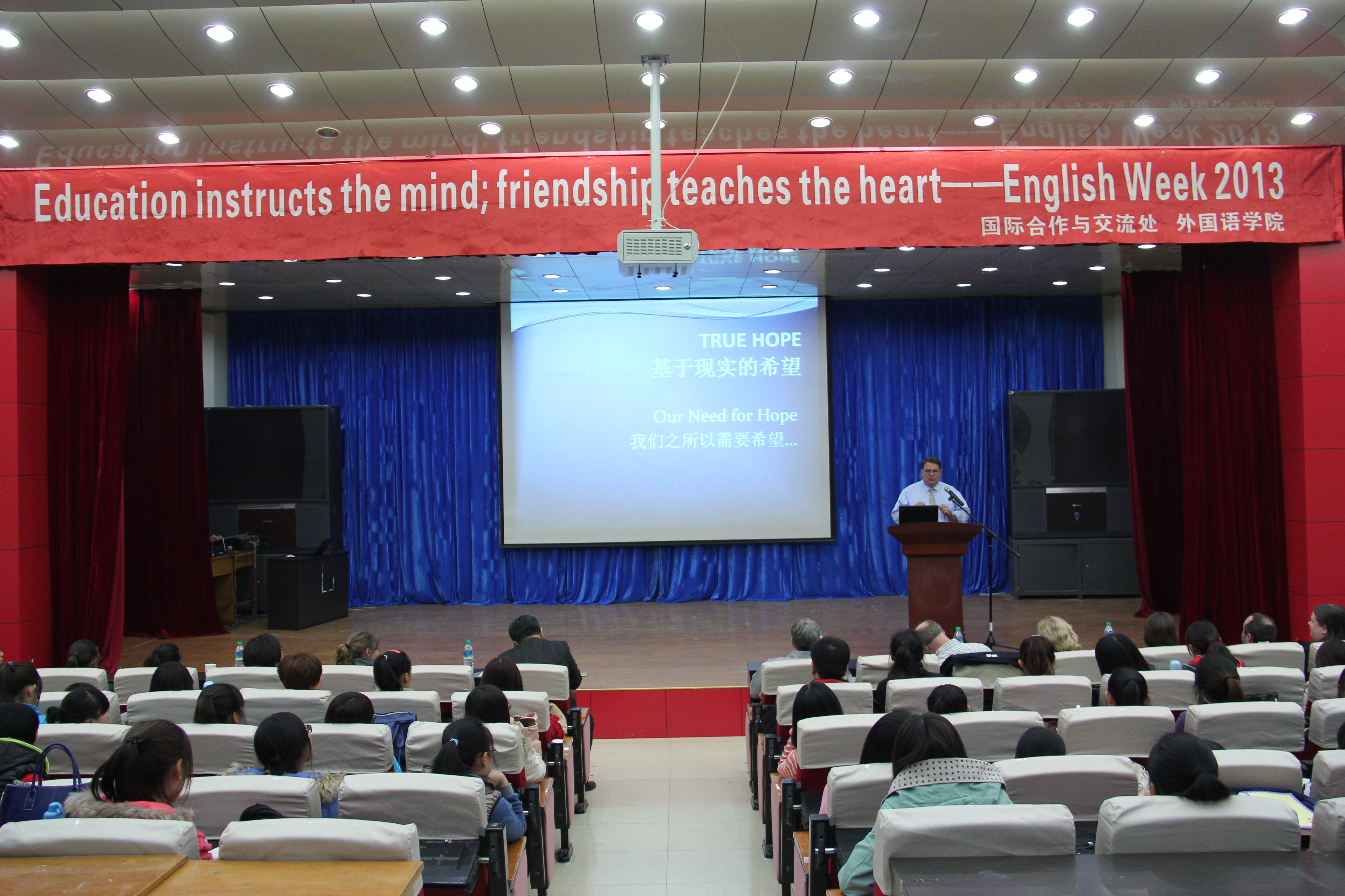 2013年10月25日晚,由我校国际合作与交流处主办,0638太阳集团官网承办的“启梦科师2013”系列活动之英语周在开发区校区学术报告厅闭幕。国际合作与交流处、0638太阳集团官网相关领导及师生400余人参加了闭幕式。