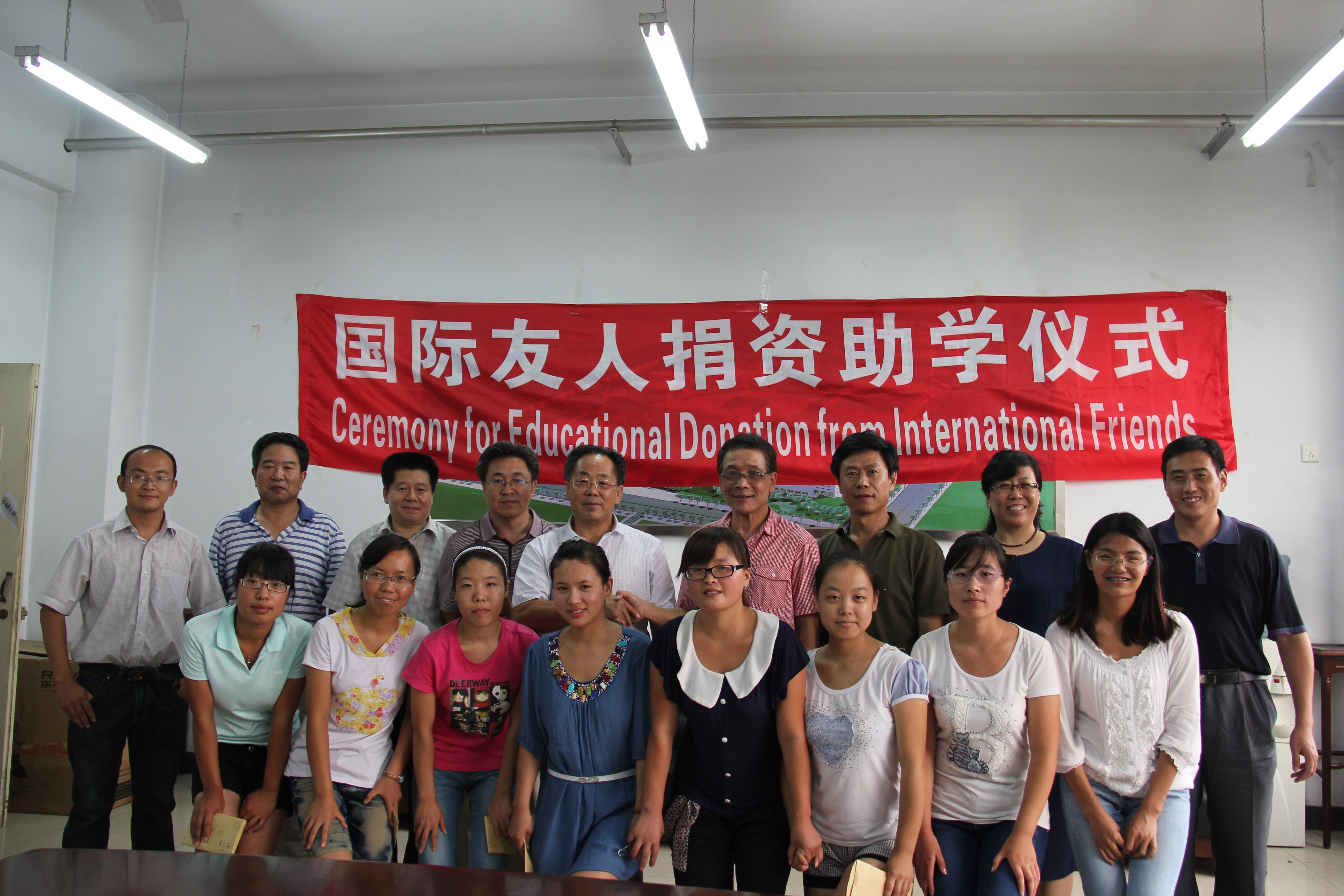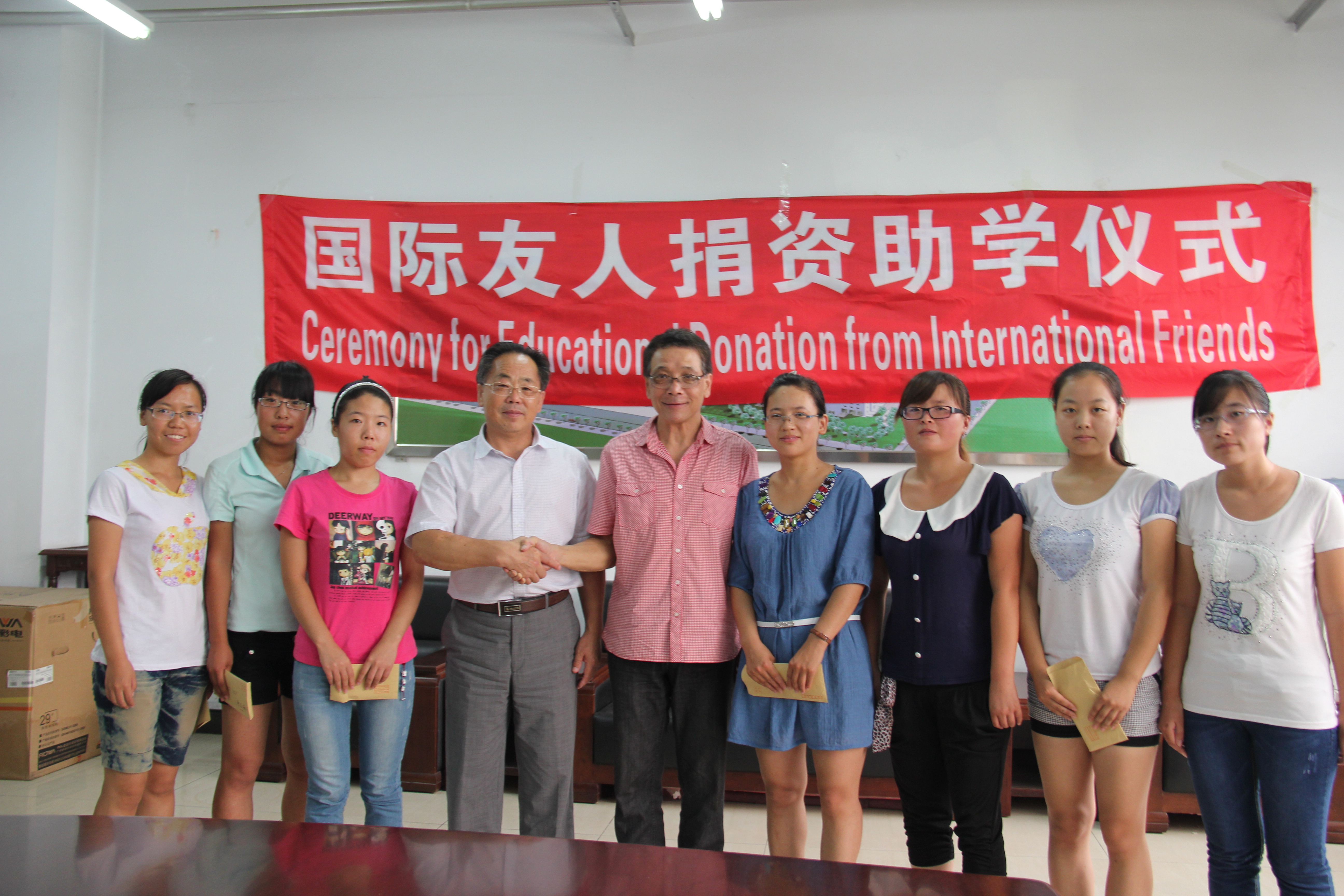 2012年8月30日下午,国际友人捐资助学仪式在开发区校区一楼会议室举行,学校孟令臣副校长、党委宣传部田毅部长、国际交流处东方阳处长、学生处冯瑞银处长、0638太阳集团官网院长邵丽君、副院长游建民参加此次活动,仪式由0638太阳集团官网党委书记刘朝晖主持。此次捐资助学活动由我校澳大利亚籍华人教师Michael先生发起。Michael先生到我校0638太阳集团官网任教后,教学之余非常关心我院学生的生活和成长,看到有些学生因家庭贫困求学困难时,决定对这些同学提供帮助。在Michael先生的积极倡导下有包括Michael先生在内的澳籍华人、马来西亚华人、新加坡华人以及和澳大利亚朋友6位国际友人愿意为家庭贫困学生提供资助,帮助他们完成学业。此次共募集人民币41000 元,有8 名学生获得资助。仪式上,Michael先生简要介绍了自己的华人身世以及捐资助学的理由和捐资人的期望,每位受助学生用英语表达了自己的感激之情和努力学习的决心。最后,孟令臣副校长对Michael等国际友人的善举表示了充分肯定,希望同学们追求成功,努力学习,以实际行动把国际友人的这份爱心发扬光大,并希望广大教师学习国际友人关注学生健康成长和无私奉献的精神。