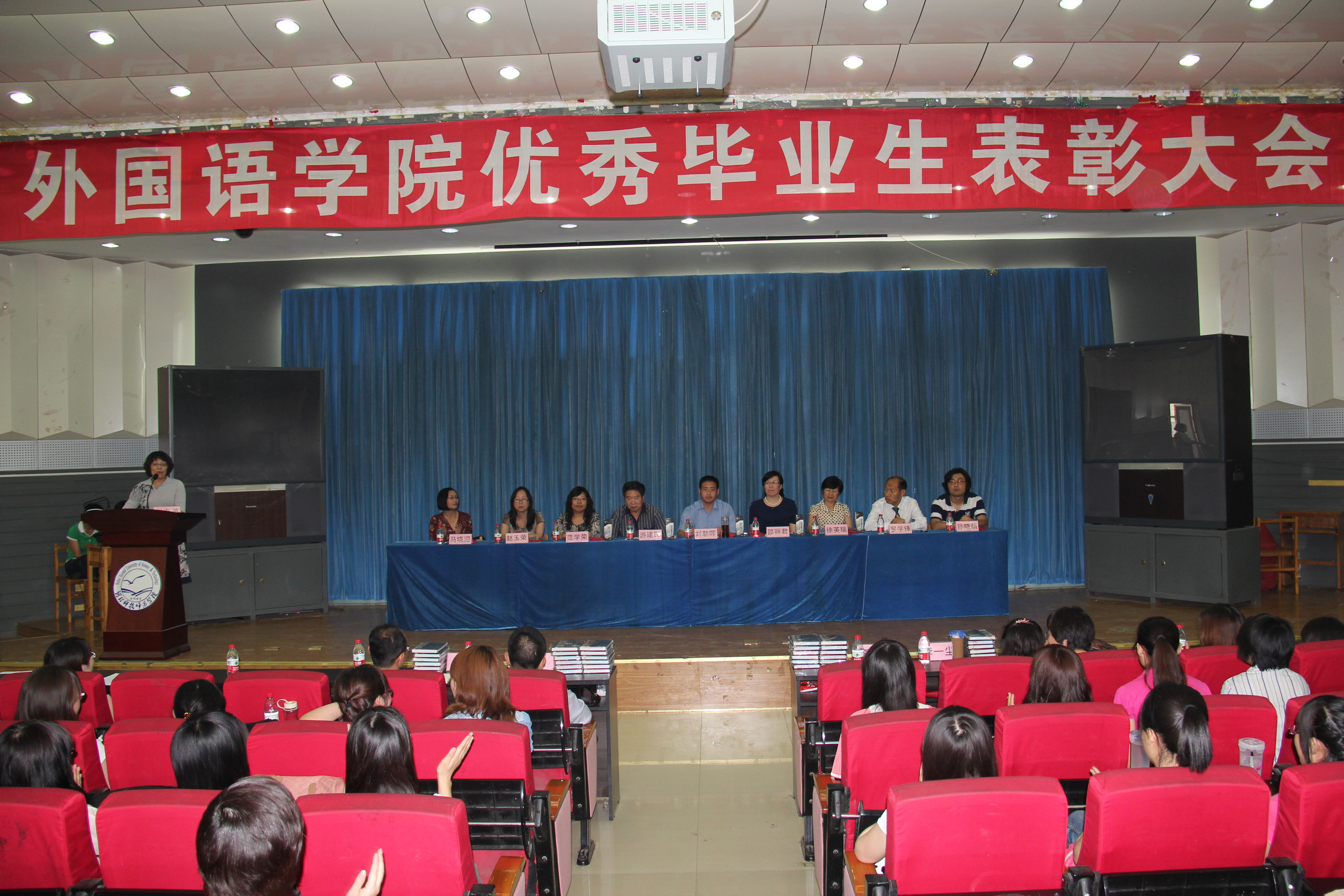 为进一步加强学风建设,树立典型,充分发挥优秀毕业生的示范激励作用,同时鼓舞学院学生考研的积极性和主动性,0638太阳集团官网于6月12日在开发区学术报告厅召开2012届优秀毕业生表彰大会。大会由0638太阳集团官网副院长崔海英副教授主持。出席大会的领导和老师有0638太阳集团官网党委书记刘朝晖老师、院长邵丽君教授、副院长游建民教授、英语本科教学部主任范学荣副教授以及教师代表徐英瑞教授、赵玉荣博士、罗学锋副教授、马晓迎副教授、孙晓萌老师。另外参加表彰会的还有我校2010届优秀毕业生、现任海港区政协委员、大学生村官、海港区海阳镇海阳四村党支部副书记、海天考研培训学校营销部张超经理。09、10级全体本科生参加了大会。表彰大会由0638太阳集团官网副院长崔海英老师主持。