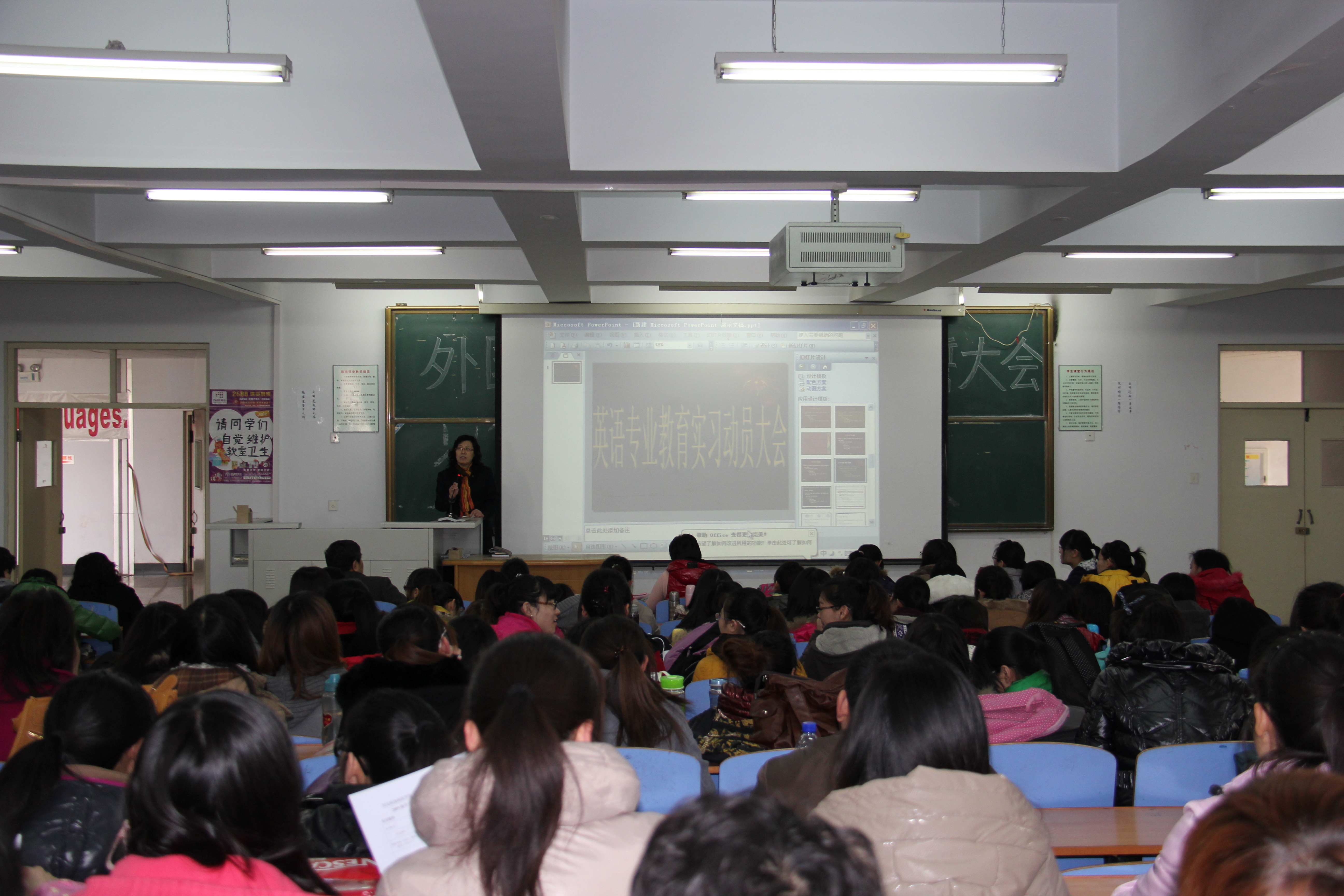 0638太阳集团官网英语专业教育实习动员大会于2012年3月22日在开发区校区举行。参加此次教育实习动员大会的有学院党委书记刘朝晖书记、副院长游建民教授、副院长崔海英副教授、英本教研室主任范学荣副教授、旅游英语教研室主任罗学锋副教授、英语本科教研室的教师们和09级英本和11级英语专接本的同学们。0638太阳集团官网院长邵丽君教授主持了此次大会。