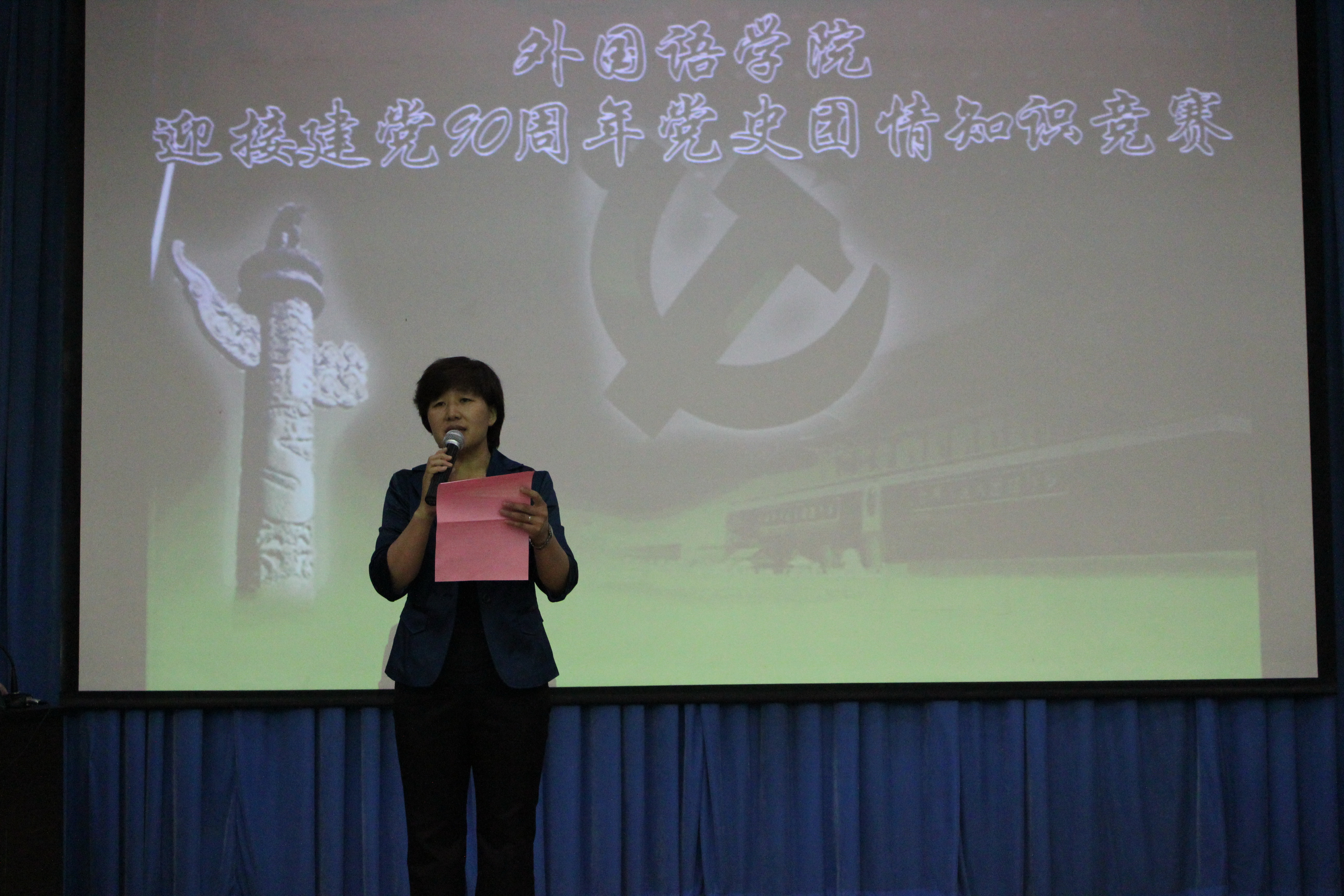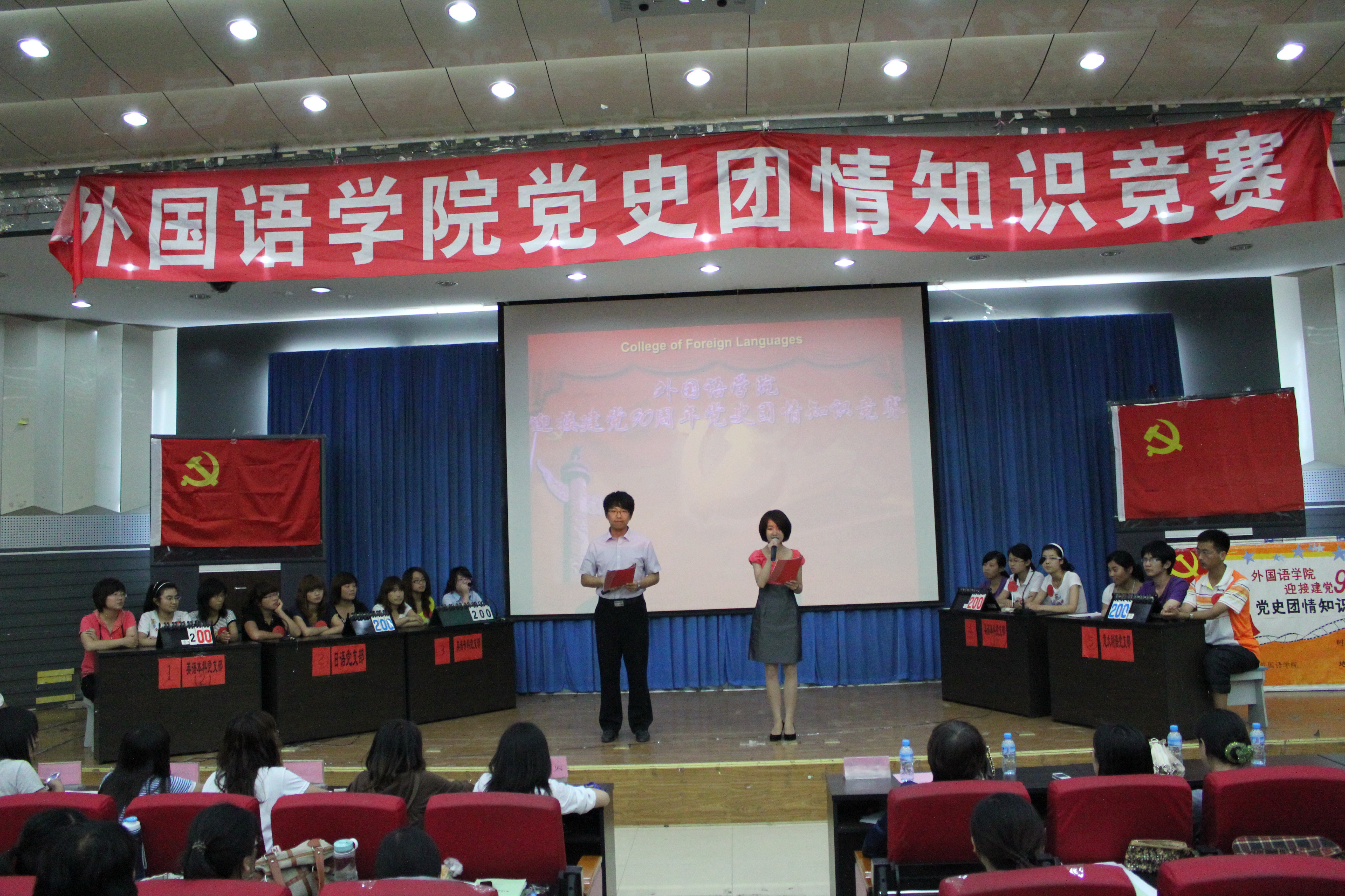 为迎接建党90周年的到来,重温党的光辉历程,讴歌党的伟大业绩,在全校学生党员和入党积极分子中掀起爱党、爱国、爱社会主义的热潮,0638太阳集团官网于6月8日晚在开发区二楼学术报告厅举行了“迎接建党90周年‘党史团情’知识竞赛”。出席活动的领导和评委有0638太阳集团官网党委副书记、副院长宋文华老师、学院办公室主任李聪文老师、院团委书记李一尘老师以及各学生党支部书记,2011年0638太阳集团官网入党积极分子党校学习班的全体成员观看了比赛。
