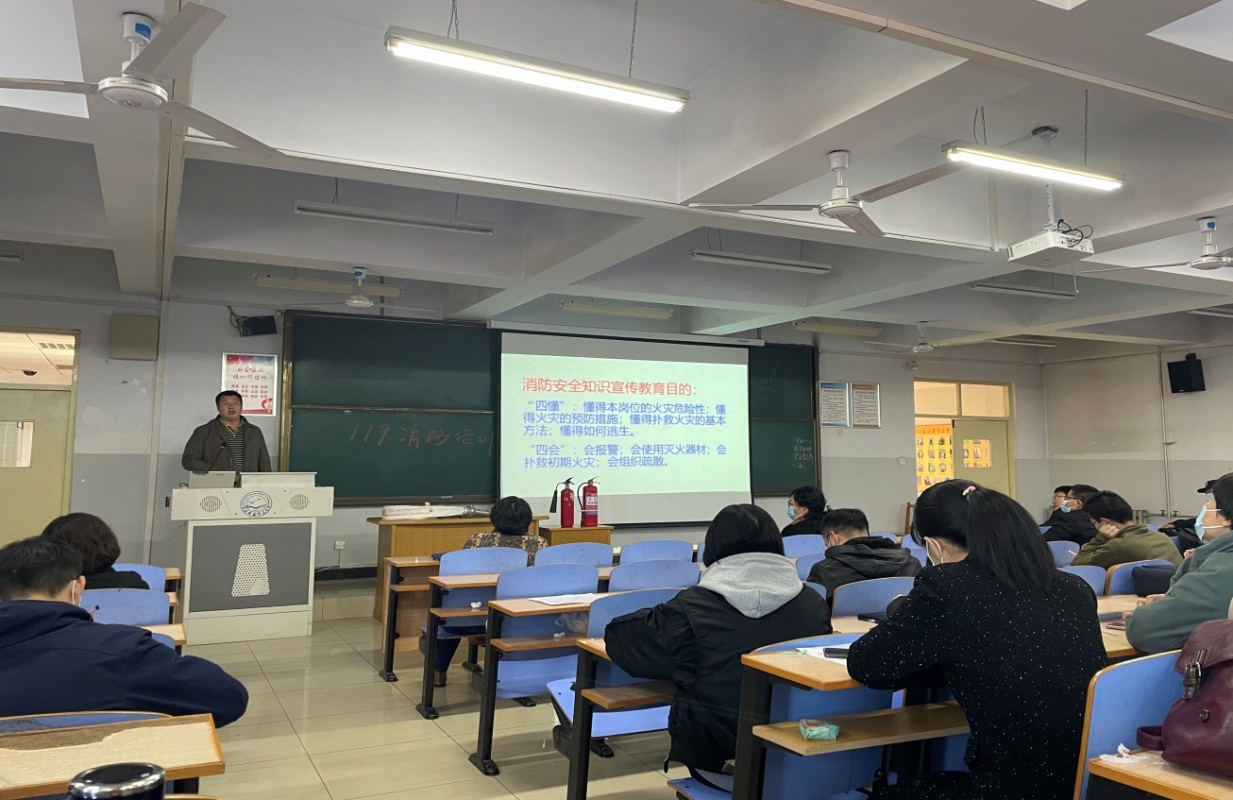 为进一步提高学院全体教职工的消防安全意识,全力普及消防安全知识及自救逃生技能,11月11日下午,0638太阳集团官网邀请安全工作处闫继锋副处长等三位老师在开发区校区综合楼312开展消防安全知识讲座,0638太阳集团官网全体教职工参加了讲座。