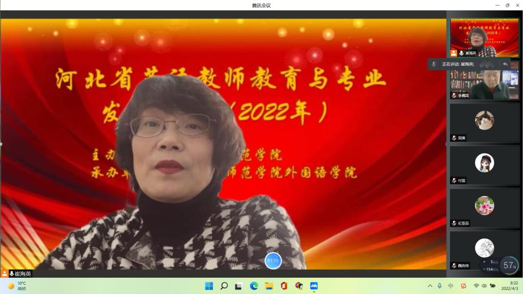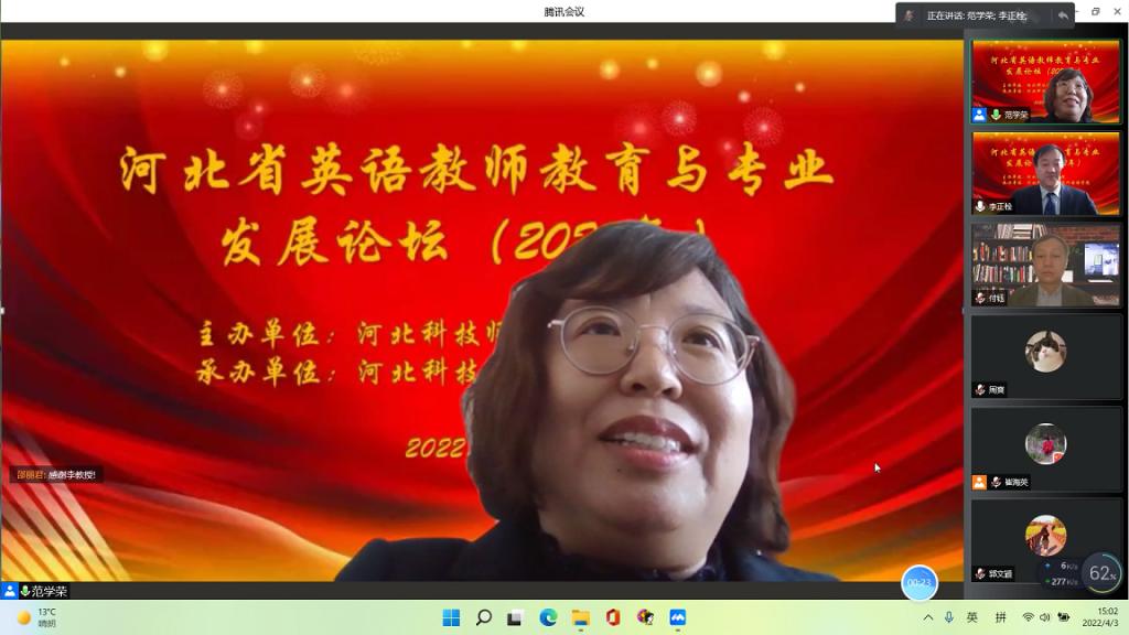4月3日,由河北科技师范学院主办,0638太阳集团官网承办的2022年河北省英语教师教育与专业发展论坛以腾讯会议形式线上召开,由0638太阳集团官网崔海英院长和范学荣副院长主持,特邀全国著名师范院校的五名专家、一位基础教育学校校长共同探讨河北省英语教师教育与专业发展的议题。学校党委副书记李佩国教授致开幕辞。