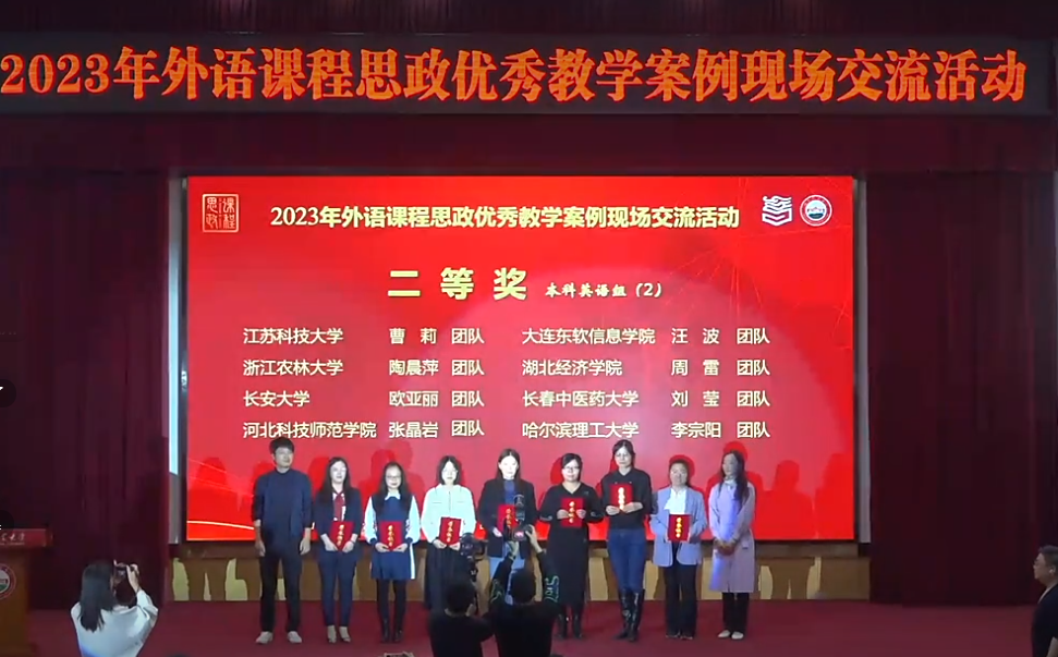 为全面深化高校课程思政建设,持续提升外语教师课程思政教学能力,高等教育出版社、全国高校教师网络培训中心及《中国外语》编辑部联合主办了2023年外语课程思政优秀教学案例征集与交流活动,我院的付蕊团队荣获了该赛事河北省优秀作品特等奖,于11月11日代表河北省参加第三阶段全国高等学校外语课程思政优秀教学案例现场交流活动。本次交流活动分为大学英语组和英语类专业组,共有71个团队参与最后的角逐。我院张晶岩、李冬媛代表团队荣获大学英语组二等奖。
